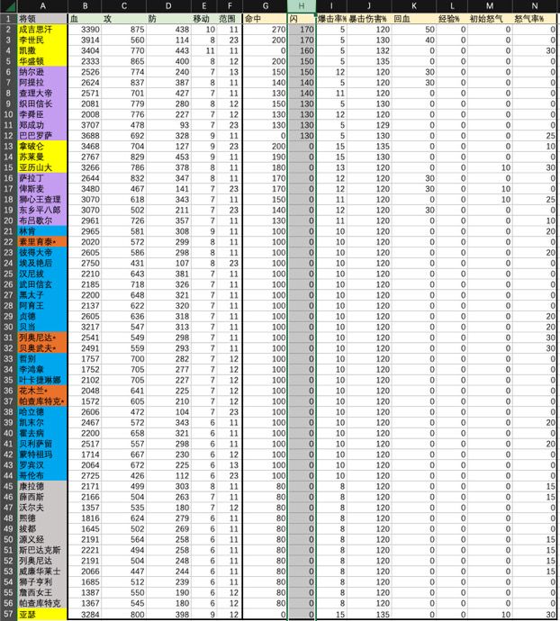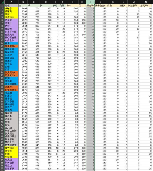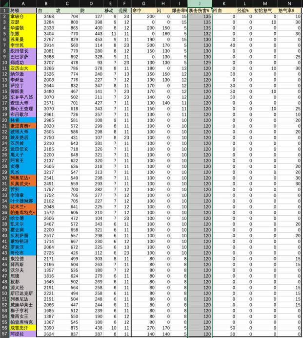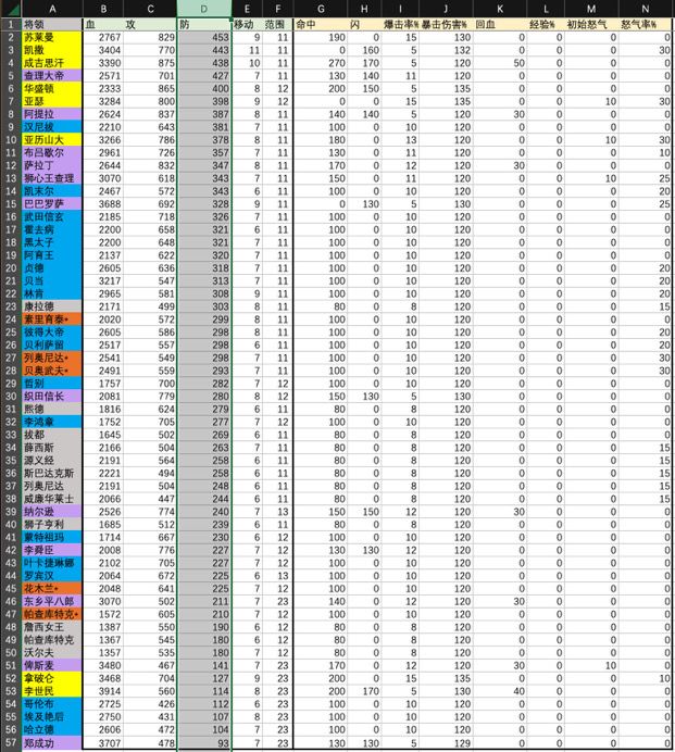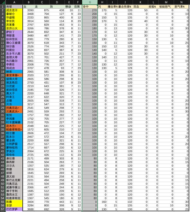 本来是截图所有将领数据的,但是图片太多,不直观数据展现,还是做了个表格