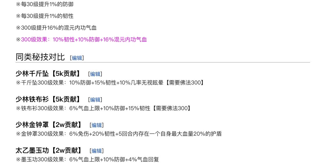 就上图直接说说互相冲突的防御秘技吧,金钟罩不用讲,强!铁布衫对男号而言强于墨玉功,对女号而言比墨玉少了1气血1防御,弱于墨玉。千斤坠并不属于此行列(因为它和五禽戏一样可共存),说说天武吧,强得一批,图在下面。6血10防(上图攻略有误),不次于墨玉功,更何况300级特殊效果,目测会很好用,和铁布衫不相上下吧,铁布衫12防!wiki这个写错了。