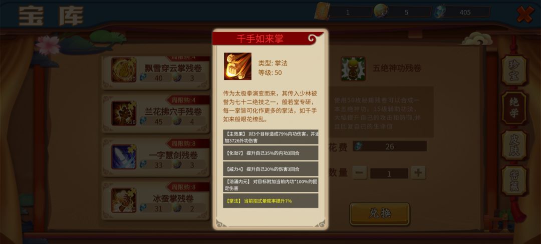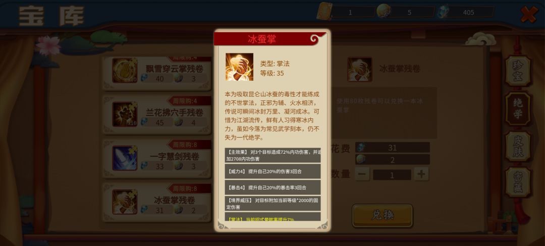 二挂的出现,势力宝库也更新一些新技能,对于虚竹,段誉前期都可以过渡,例如冰蚕掌对三个目标,提升自己20%伤害-20%暴击。