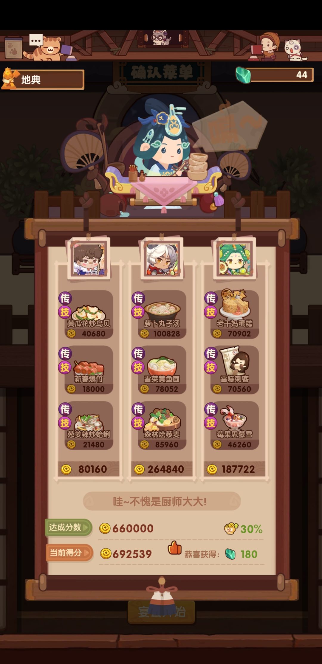 看了论坛好多新手帖子试了下都不太行,偶然之间发现莓果思慕雪分挺高的,分不够的可以试试。黑柏上了把金斩骨刀,其他两个不用厨具。