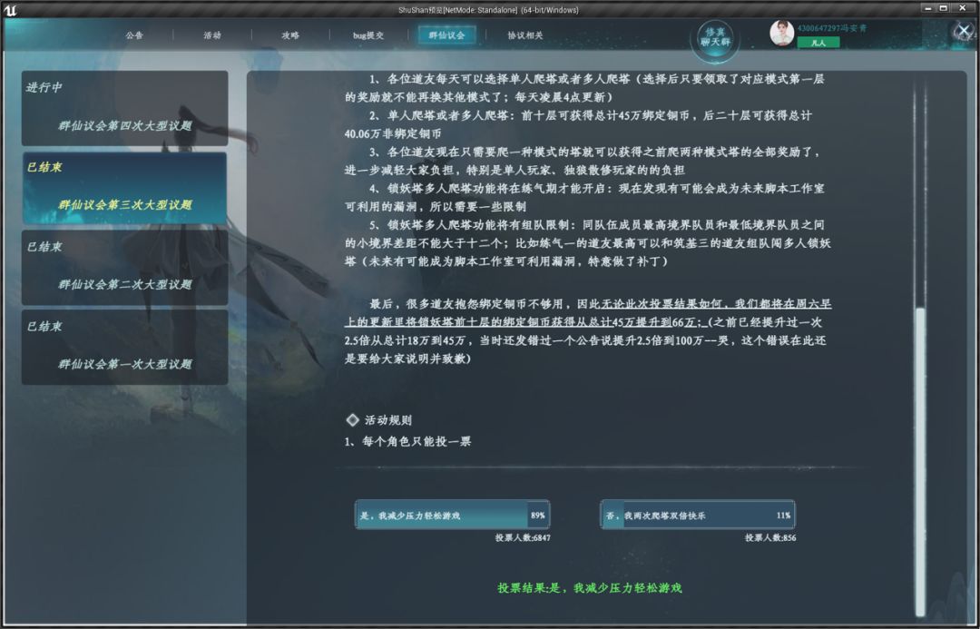 (锁妖塔因为是游戏内唯一非绑铜币的产出地,特别重要;因此我们将在群仙议会反复提出议题与大家一起反复调试:当前还有第四次议题等待大家投票参与)