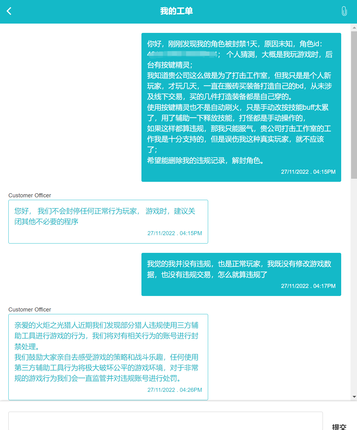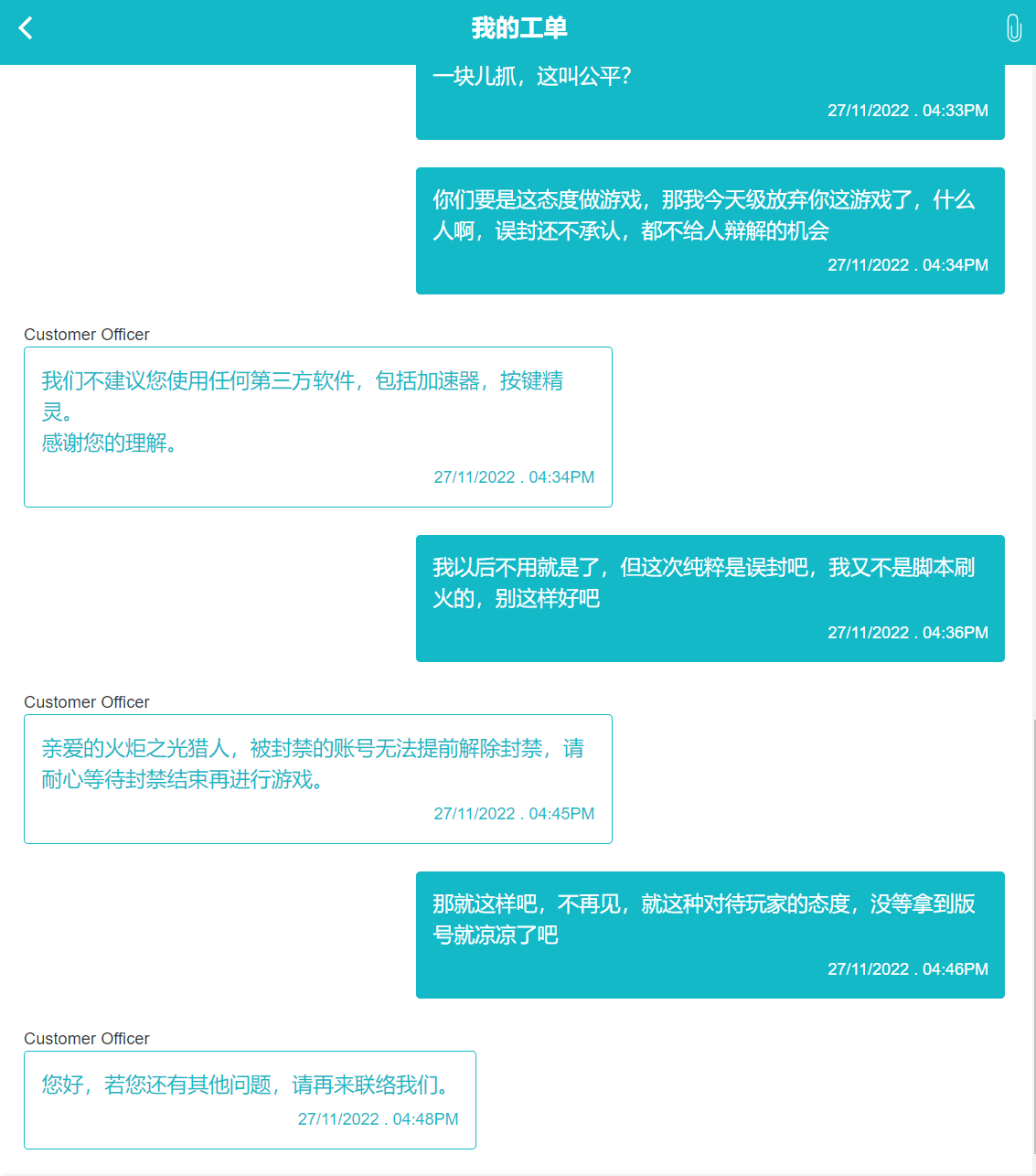 公牛、嗜血术两个buff时间太短了,3秒一放,按的手疼,于是用了按键连点技能,没想到直接就给封了,连提前警告都不给,真霸道的游戏,制裁不了工作室就制裁玩家,客服来来回回就那几句话,只会复制话术,不正面回答问题,也不说人话,就这种态度做游戏,等不到拿到版号就凉凉了吧;