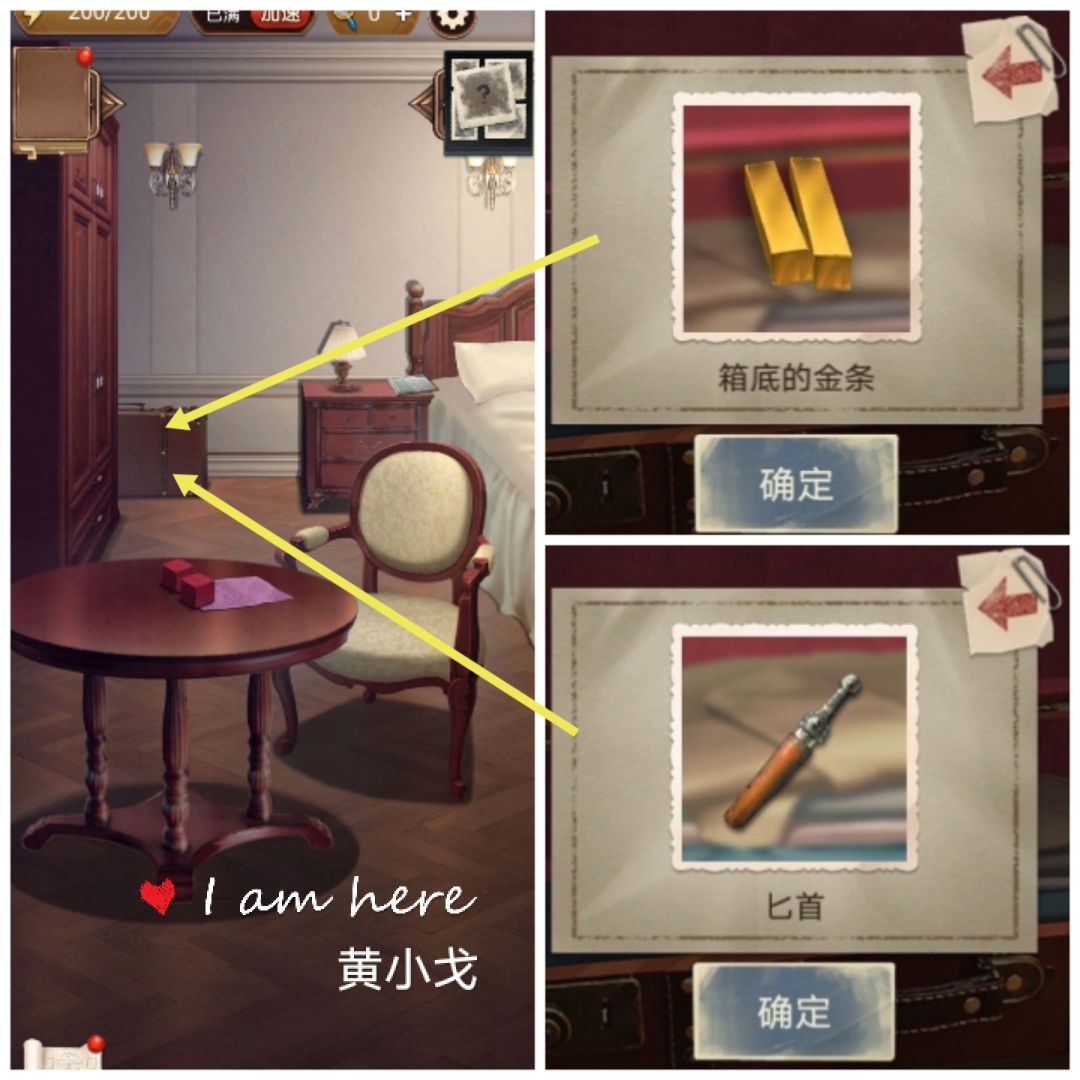 【一串钥匙】、【一张信签】、【一块肥皂】、【箱底的金条】、【小铁盒】、【报纸】、【两只绒盒】、【膏药】、【匕首】→梁尚墨房间的线索