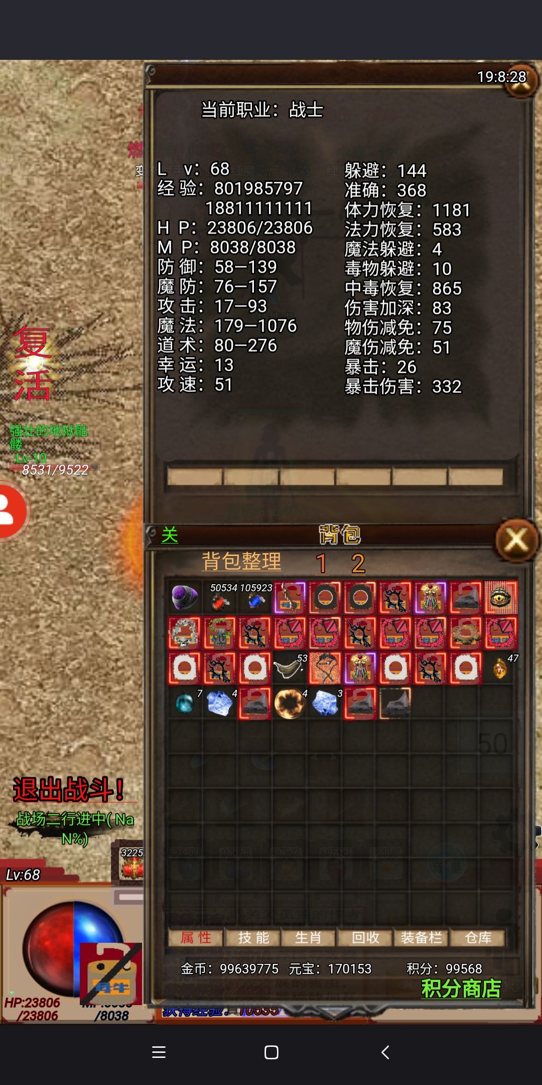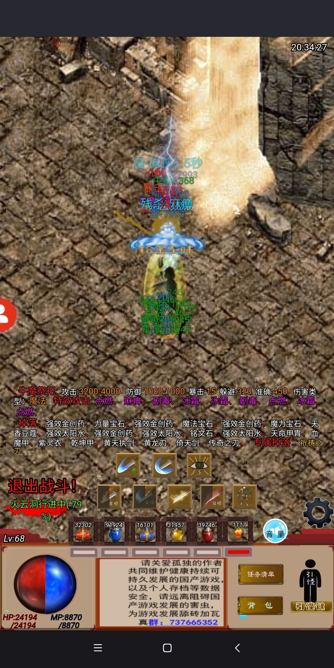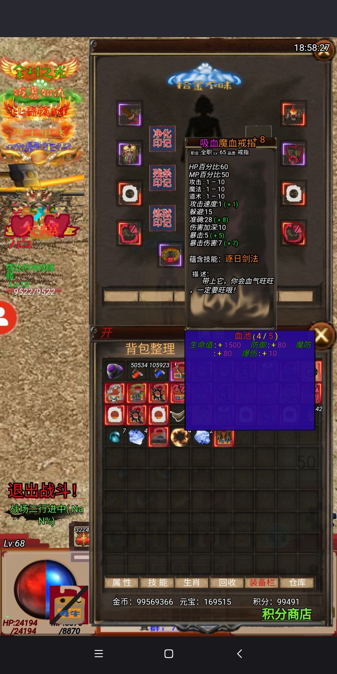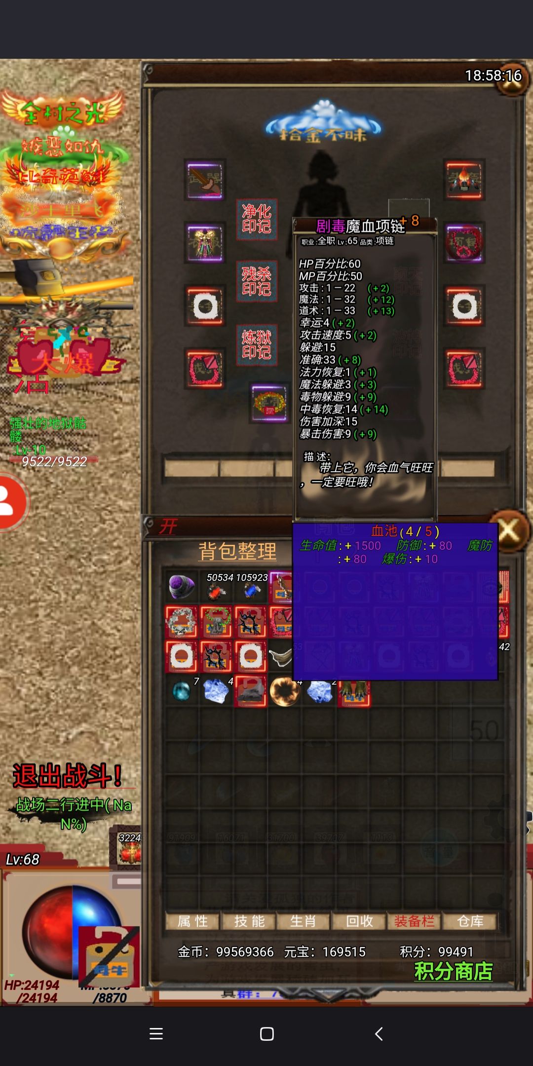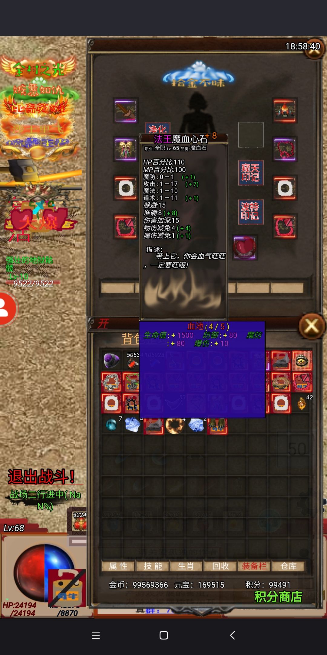 装备和我差不多的,可以去打猪血石和项链, 也是有不少提升 进入封魔一定要带够灵气魔气各200个 我怕你没灵气出门,刷牛粪出去时间太久太久