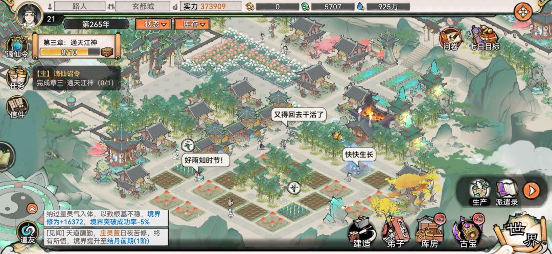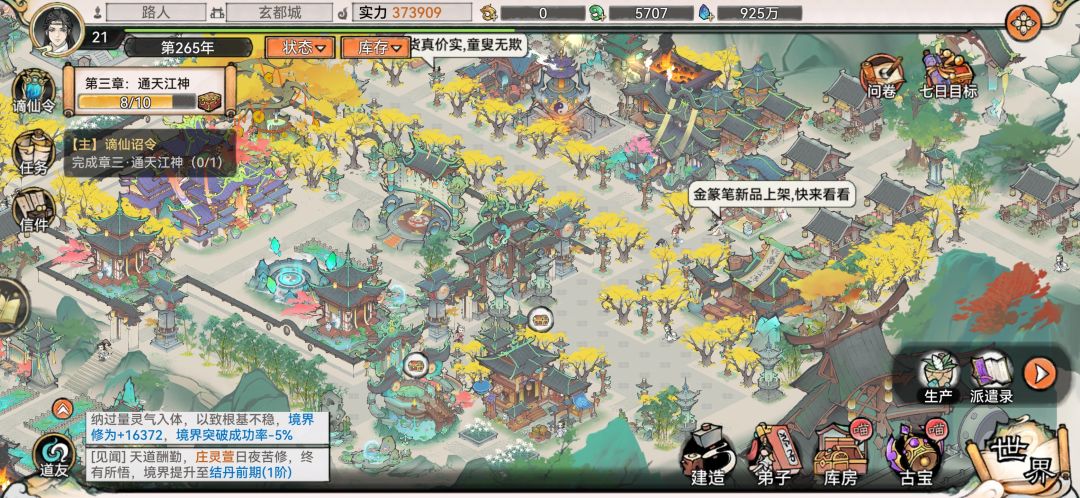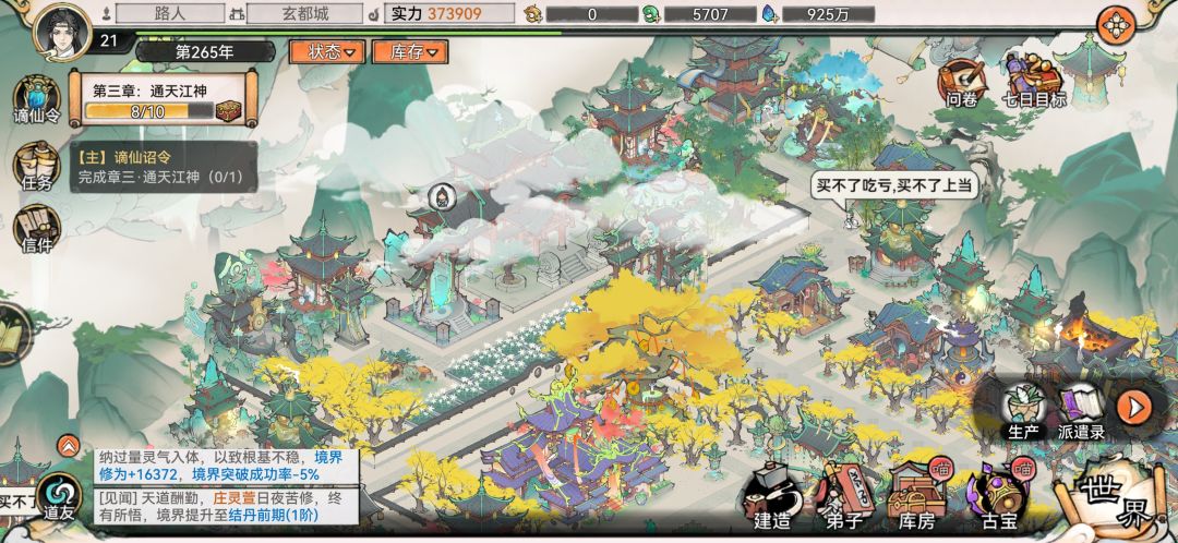 (5)系统的不完善,作为一个有着建筑摆放玩法的游戏,没有总体拍照模式说不过去吧?还有等级提升以后,世界就不会刷出低级妖怪,但有些低级丹药需要低阶妖怪的妖丹。这导致了想养出主队以外的弟子尤其困难(这里提一点打世界妖怪的时候能不能别跑来跑去一个个打?)。另外,宗门弟子突破建议做个一键突破(隔了一天看着几个弟子都要一个个点突破有点烦)。世界里的宗门玩法可以随着等级的提升而增加潜入拓印功法的次数(毕竟功法等太靠脸)。