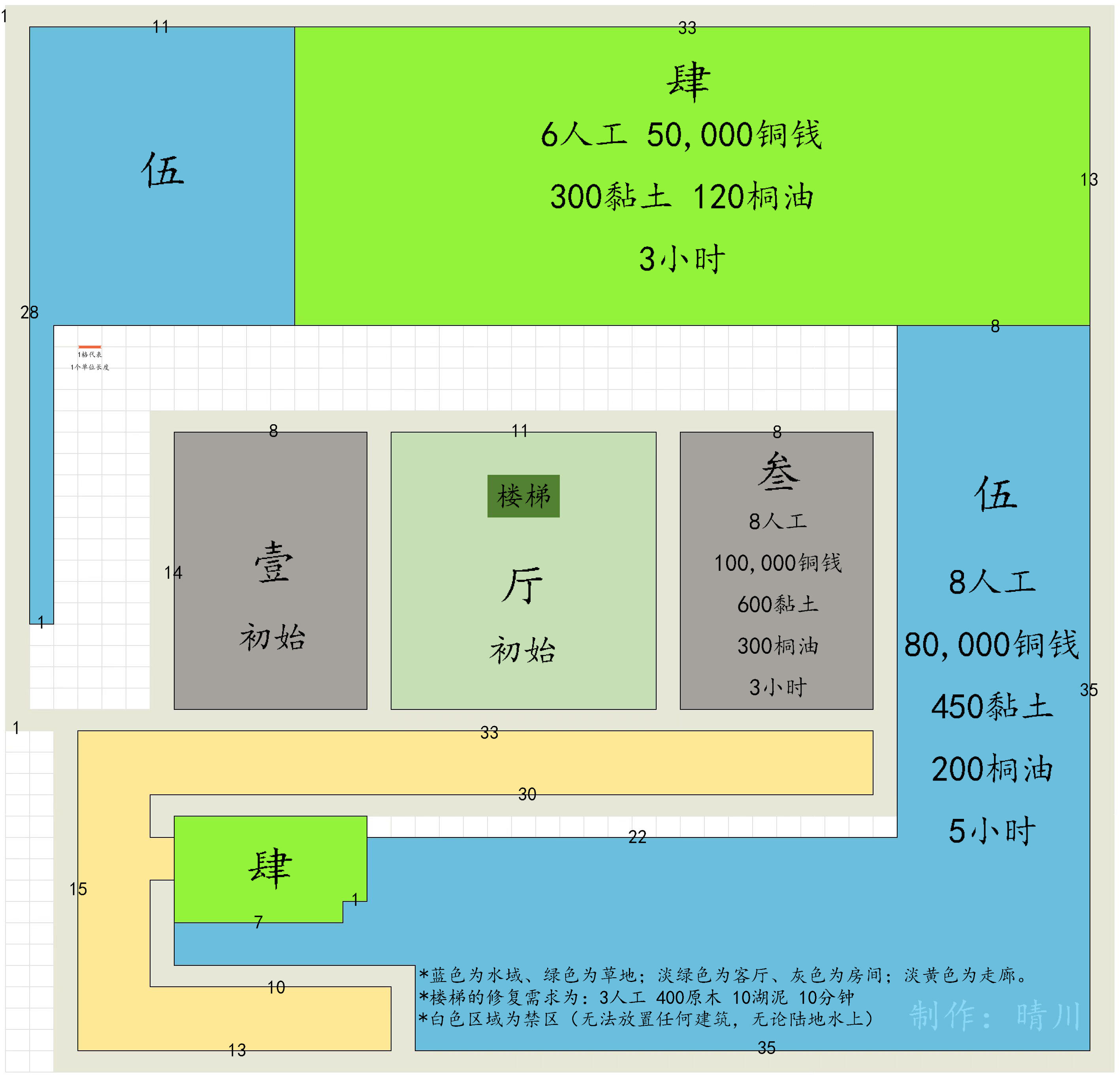 苏州府邸内可以打造一些水上建筑和植物(草坪);这些建筑仅能放置在特定区域。