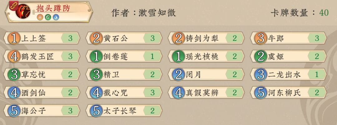 这个卡组没啥好说的,二三费随便拿拿灵玉,尽量跳费上海公子,然后倒卷、草忘忧防大法术或者跟着拿灵玉,一般的法术套都会直接被憋死,虞姬更是爆杀各路因缘。