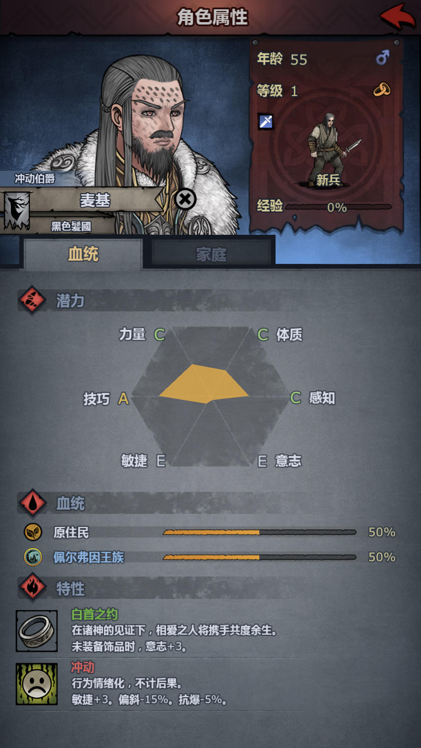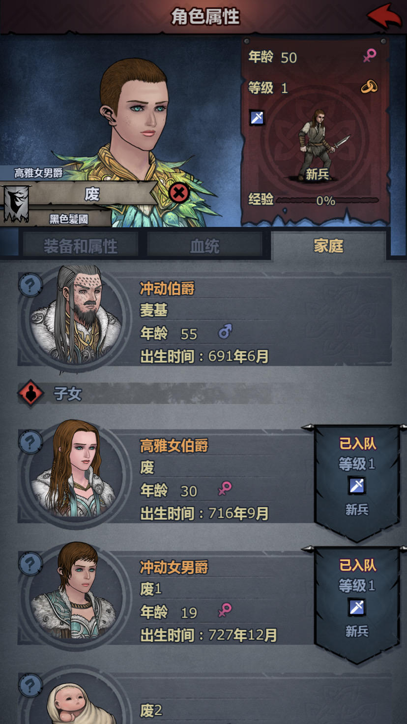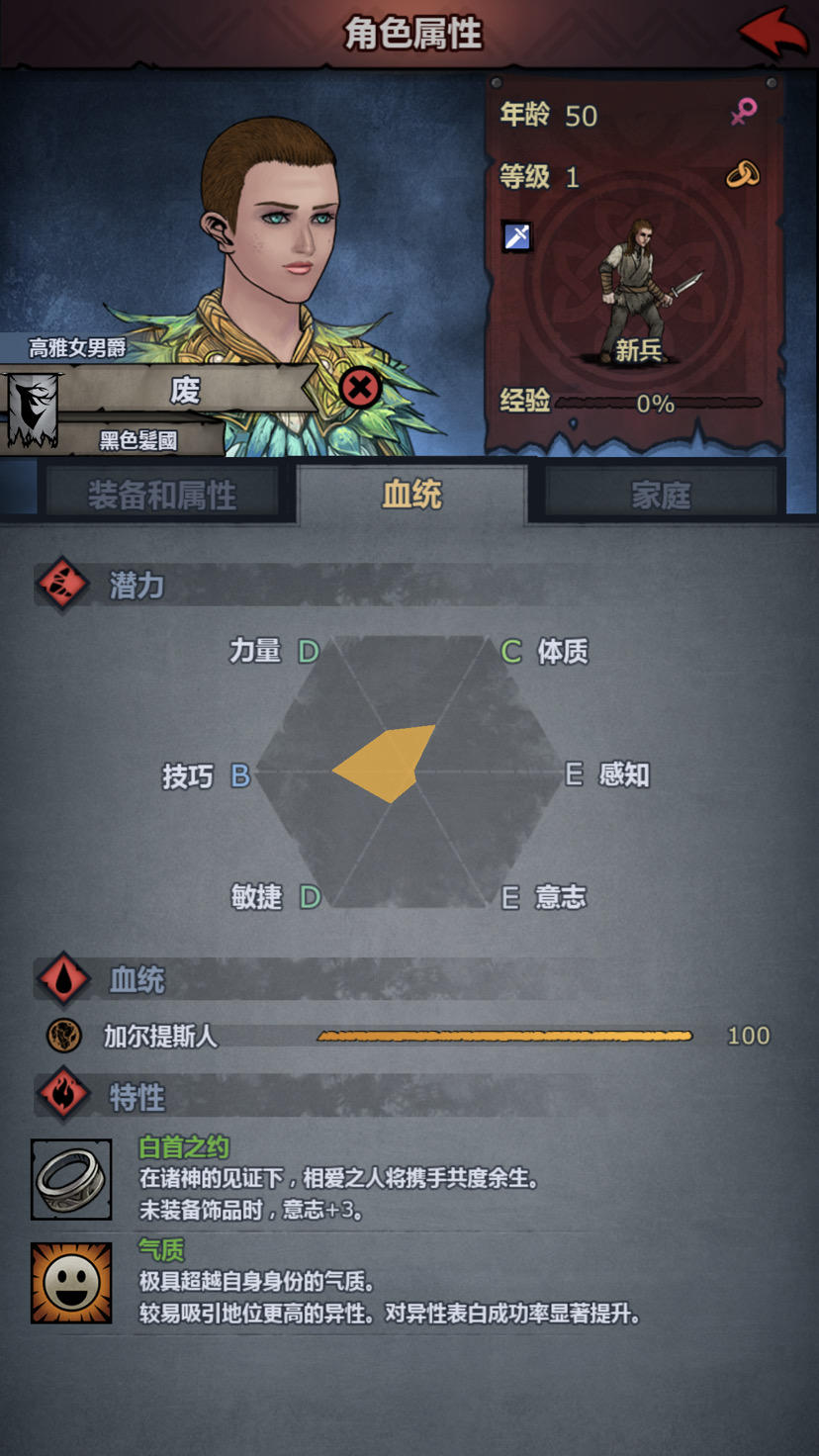 气质平民血找了个50佩尔血的伯爵男人,生下来三个娃都是平民血混血,大女儿和二女儿都遗传到了气质,第三个娃等后面看看能不能学到。