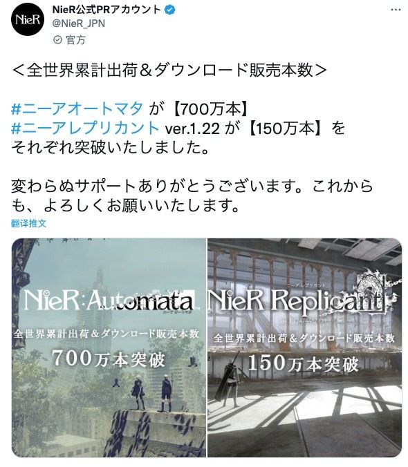 据《尼尔:机械纪元》官方消息,该游戏的《尼尔:机械纪元》全球总出货量和下载销售数量现已突破 700 万份。(其实销量已经很不错了。)
