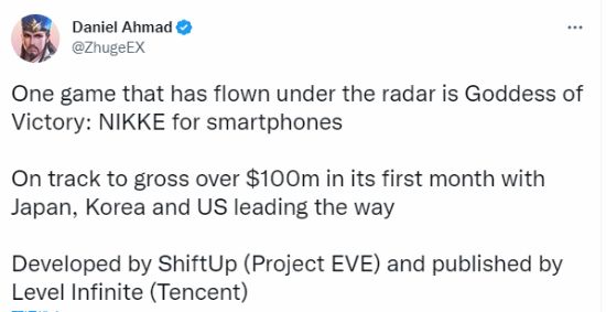 据知名分析师Daniel Ahmad消息,美少女射击游戏《胜利女神:妮姬》的首月收入有望超过1亿美元。而其中,日本、韩国以及美国贡献占比前三。