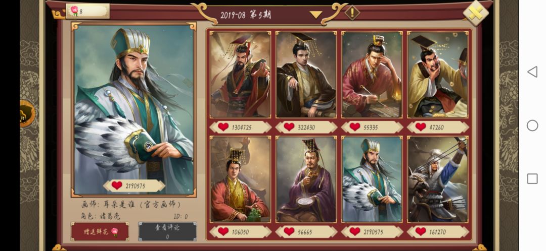 人气排行榜第一:诸葛亮(不愧是丞相,就是这么厉害) 人气:2190575
