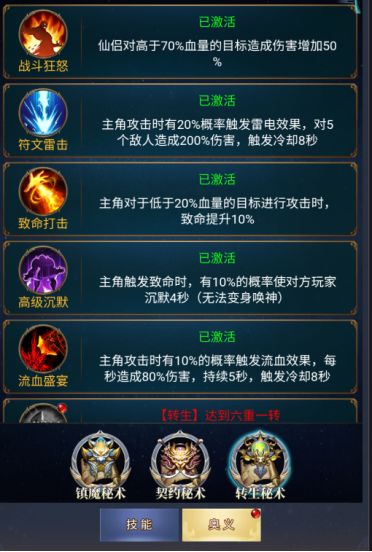 秘术即为被动技能,在某些特殊情况下,能发挥出意想不到的效果。又分为三大秘术,镇魔秘术、契约秘术、转生秘术。可以通过爬镇魔塔、完成契约秘术任务、转生来激活秘术技能。