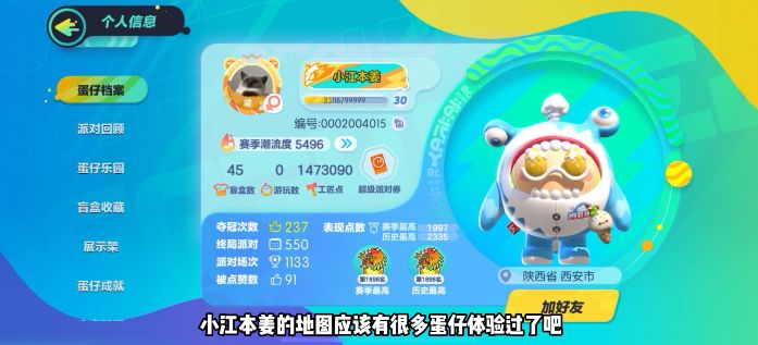 小江本姜:我是蛋仔刚开始公测的时候就在B站上刷到了视频,看到圆滚滚的蛋仔超级可爱,就下载下来一直玩到了现在。