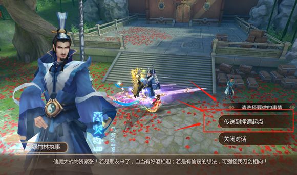 ⑨押镖结束后不用自己跑回起点!点击终点处的绿竹林执事可以直接传送回起点。追随队长的队员先暂时解除追随,自行点击绿竹林执事,不然你还是会自己往起点跑的。