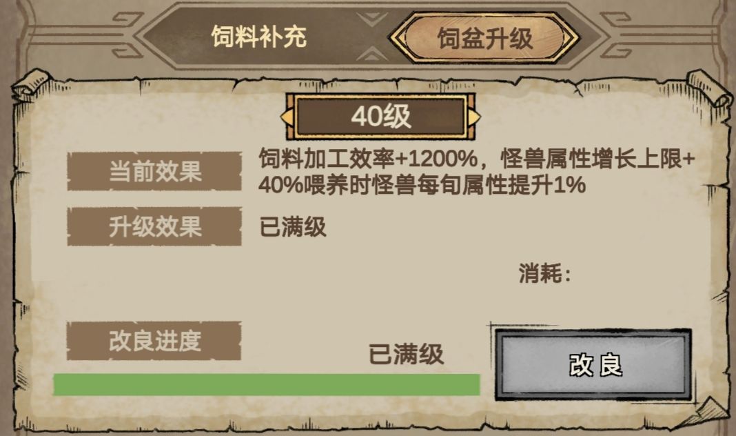 40%的巨大提升,并且普通怪兽只需要5旬(左右)即可达到,可能这和加工效率有关,我现在一只怪兽一旬消耗2000饲料,一万饲料就喂满了,喂满后饲料消耗会降为零。