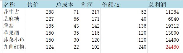 剔除需要从种子商人那购买原材料的食方后,选取几个售价较高的食方进行计算。