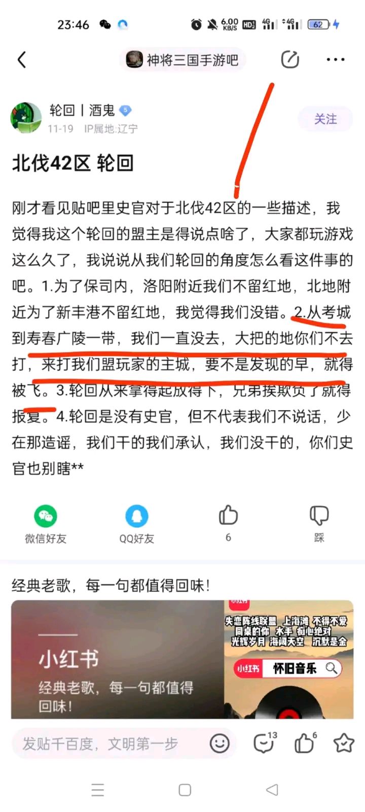 各位看官,清晨是一天的开始,本是要开心开启一天,但是我接下来的揭露的确是令人发指的某些人,千夫所指的酒鬼。由图片顺序开始讲起,截图没有任何改动遮掩: 自酒鬼擅自熔炼长空号开始,今天是第三天,中途是互骂,轮回各种护犊子以及口嗨!贴吧有的看官已经看到了,轮回酒鬼不敢就事论事,提前以前的事情,很抱歉,以前的那些事我还留的有截图。 一图,酒鬼在拿我之前的贴说事,那咱就捡重点论。他指出他们全盟没有去寿春、广陵、考城地界打地,意思是那给我们发育,然后刷战功的,洛阳许昌全部清红地。 那就看二图就知道是否属实,我截图的有暗夜一党(其实是一人控多号),此人嚣张至极,应该极其喜欢 打架斗殴吧!当然这是揭露酒鬼的狡辩帖子。另外插曲,酒鬼以江湖悠悠打黄了考城路口的一个人,将资源州全部清红,且堵住出口。期间私聊过酒鬼,此人极其危险,怕是现实生活中有杀了我的想法。当然这些只是前奏。 三,四图,是我和长空私聊互刷战功,后暗夜不知道嫉妒还是有什么恶毒的想法,把我的水寨给拆了,此暗夜也是最为恶毒的一人,后续幸灾乐祸。 五图,第五张图和第四张是同一天。中午我还在逗长空,刷战功打一半就撤退逗逗他。我们S2.3一起的,互相逗正常吧?结果下午长空找我,还被气的说错话了,轮回把长空的号熔了。后续轮回给的理由那是非常的精彩,还有不承认,威胁,嘲讽,诅咒辱骂都出来了。 这里提供长空一共将账号给了几个人,第一是我铁骑,野人活动返场第一天,长空四万金没抽中盒子,闹着汽油,就给我玩,我玩了一个下午,也是长空催我说要帮他室友打沃土,他不想上线,后续再也没有登过,因为第二天长空中盒子回归了。第二是轮回的罗灵娃娃,就是他们要求交号进盟(有一天瀚海出动势力军清考城门口的军营路障。轮回就以我上长空号做小内的理由踢了长空),图六有提到。第三是孤勇(一区闲云盟,被霸主女帝打的汽油一个赛季),长空以野人三技比武拿了第二,到我们自己二赛季的小分队吹牛,孤勇要看看长空号咋样。 图七,截图给各位看官看看轮回最恶毒的一个人,嘲讽,辱骂,幸灾乐祸,酒鬼干了熔号这种事情,还能如此发言,这个人无言可形容。 图八是轮回小内看了我们在瀚海群聊天,他又在世间骂了我,可能有些愧疚,来找我道歉。但是我们理论一番过后,他又开启了护酒鬼模式。 图九再次给看官们看看,这是昨晚轮回新的招数。