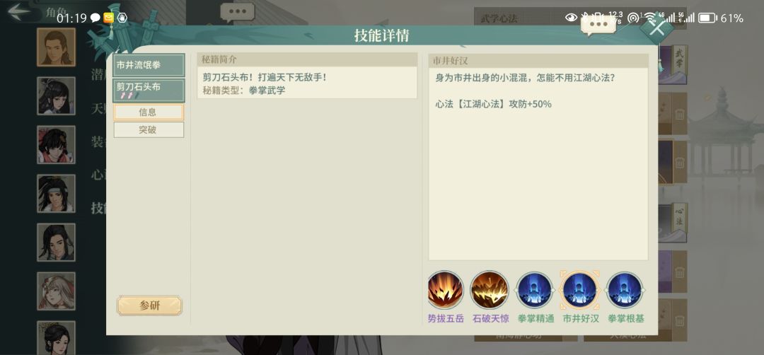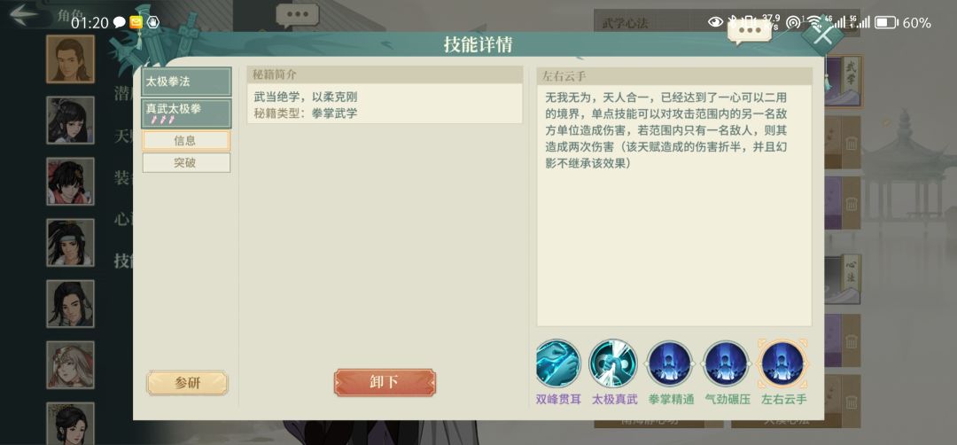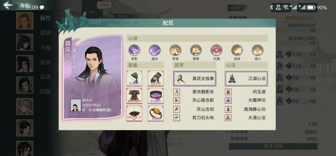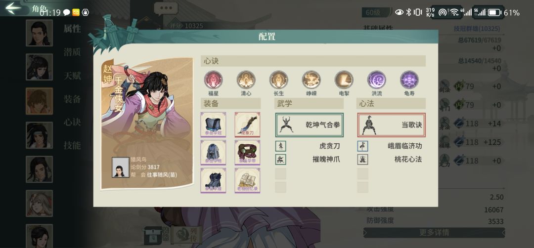 主要利用太极拳左右左手被动配合混元手套稀有词条以及承影单点真伤加上江湖心法与市井流氓拳百分之50功防增益同时天魔心诀吸血饕餮心诀回盾,突出一个一拳一个嘤嘤怪,不论挑战副本还是万象阁都是挂机不二人选!(天魔心诀为刀魔专属,其他门派切剑意潜质可换强臂等)