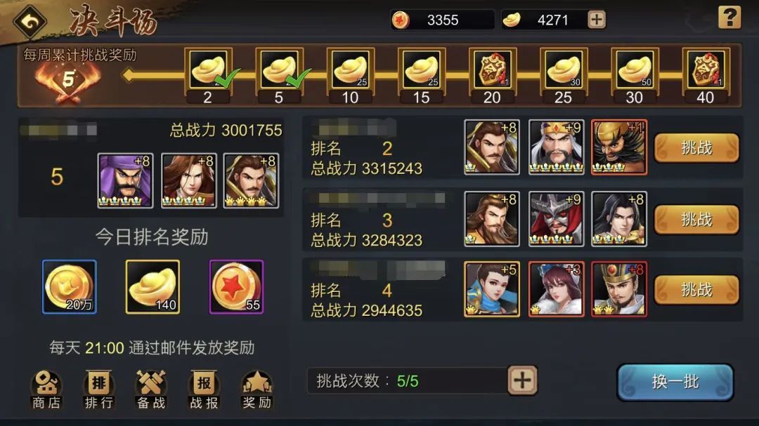 月卡之外,玩家在决斗场每天的排名奖励,也是元宝比较稳定的来源途径,通过结算排名,可以获得元宝、金币、金龙令、荣耀币的奖励,同时还有周奖励,不额外购买次数也可保底获得170元宝和1金龙令哦!因此决斗场也成了兵家必争之地,排名越高,每天的奖励越丰厚,“卡点夺名”也成了一些玩家最具趣味的另类玩法。