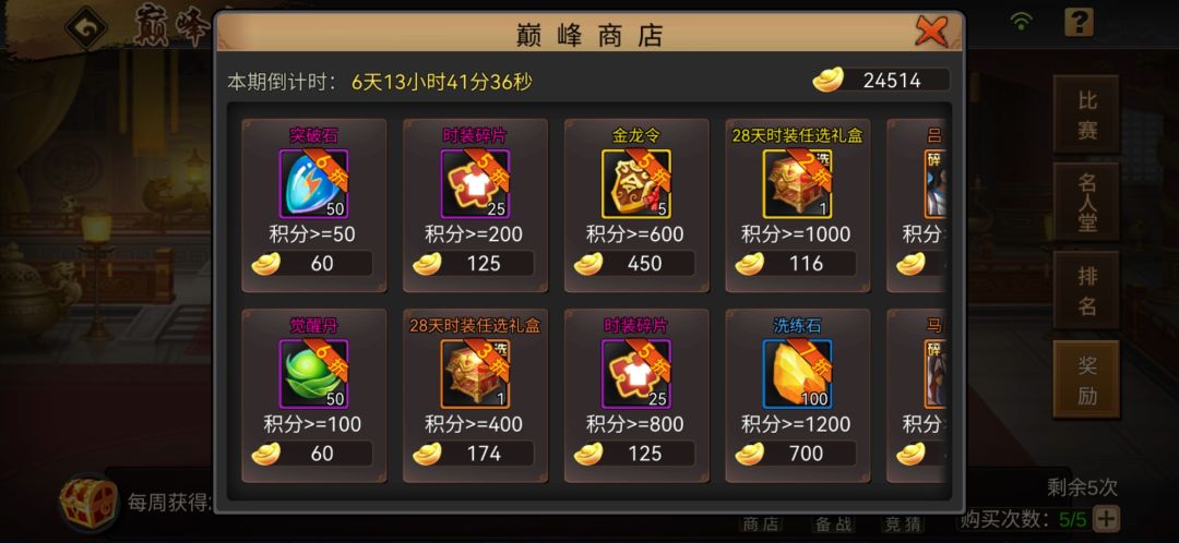 巅峰赛采取月赛制,周日晚上开赛,五次竞赛机会,额外还可以购买5次,可以获得荣耀币、时装碎片、称号,积分达到要求在巅峰商店更是可以用极低价格购买各种好物,尤其是极低价的时装礼盒和6折武将碎片,非常诱人!并不会消耗玩家花太多时间参与。