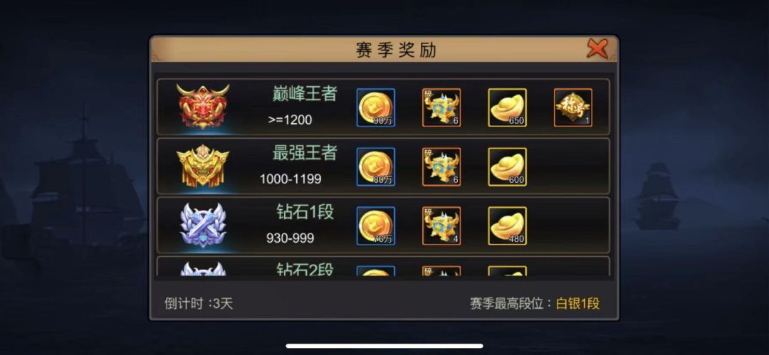 排位赛采取周赛制,可以获得大量的元宝、战魂碎片、荣耀币、金币、武将碎片(3星~皇冠不一而足),如果达到巅峰王者段位,可获得650元宝、90万金币和6个皇冠武将碎片;每周累计达到20场胜利,还可以额外获得700荣耀币和其它资源奖励,同时每晋升一个段位都有首次晋级宝箱奖励,里面也有数量不等的奖励资源哦,玩家仅需多花一些时间,不断提升自身技术和领略竞技美好的同时,可以网罗一众资源材料,积少成多,累积的量足够我们在夯实基础的道路上更进一步了!