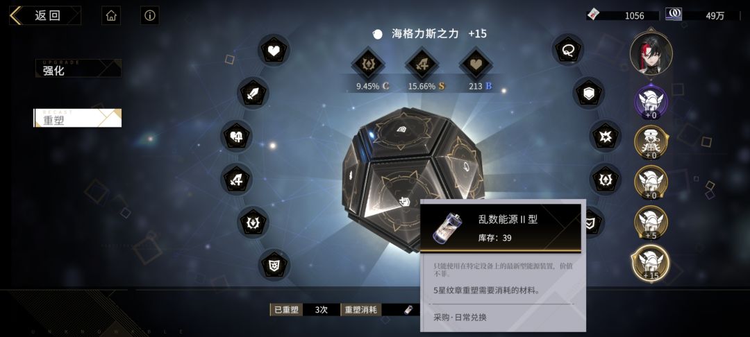 首先,重塑需要的是乱数能源,四星纹章需要的是乱数能源Ⅰ型,五星需要的是Ⅱ型。两样材料都可以在【采购】>【日常兑换】中购买到。重点:乱数能源Ⅰ可以用信用额度兑换。比起Ⅱ型用到的鸢尾金,实在是萌新之友。前期卡关的小伙伴可以对四星纹章适度强化和重塑了。