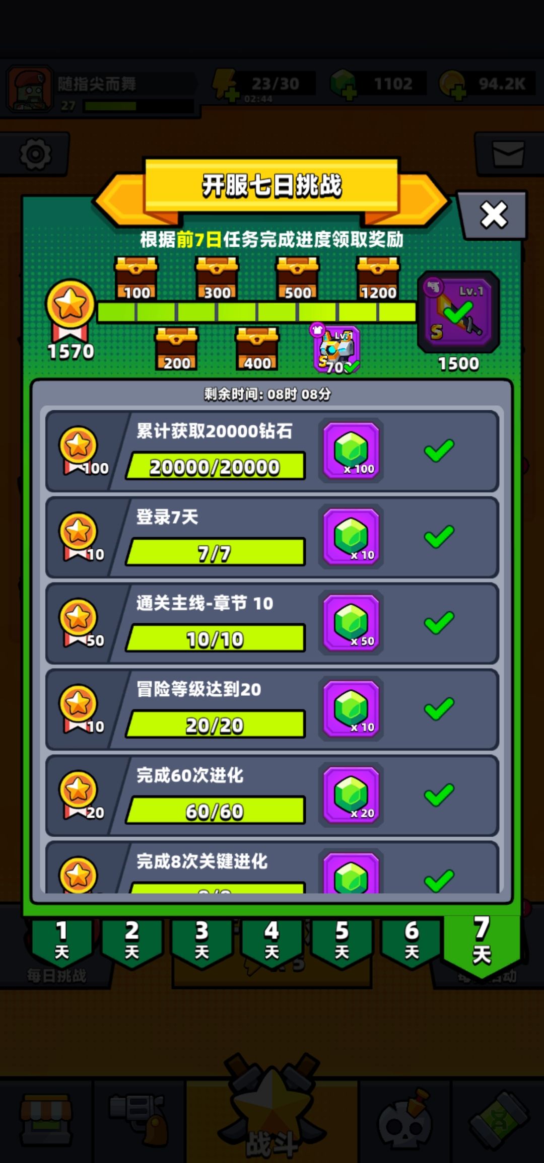 一、说一下怎么在7天0氪攒2w钻石吧 主线一关加挑战是520,22关是520*22=11440+七天的日常80*7+两周周常450*2+七日挑战1470+签到7天300+每日商店90*7+每日特惠日周月礼包10*7+50*2+100+升级奖励50*27+感恩节奖励补偿700+超级挑战600=18220,剩下1780是感恩节签到五天+新手签到7天+成就,具体记不清了。