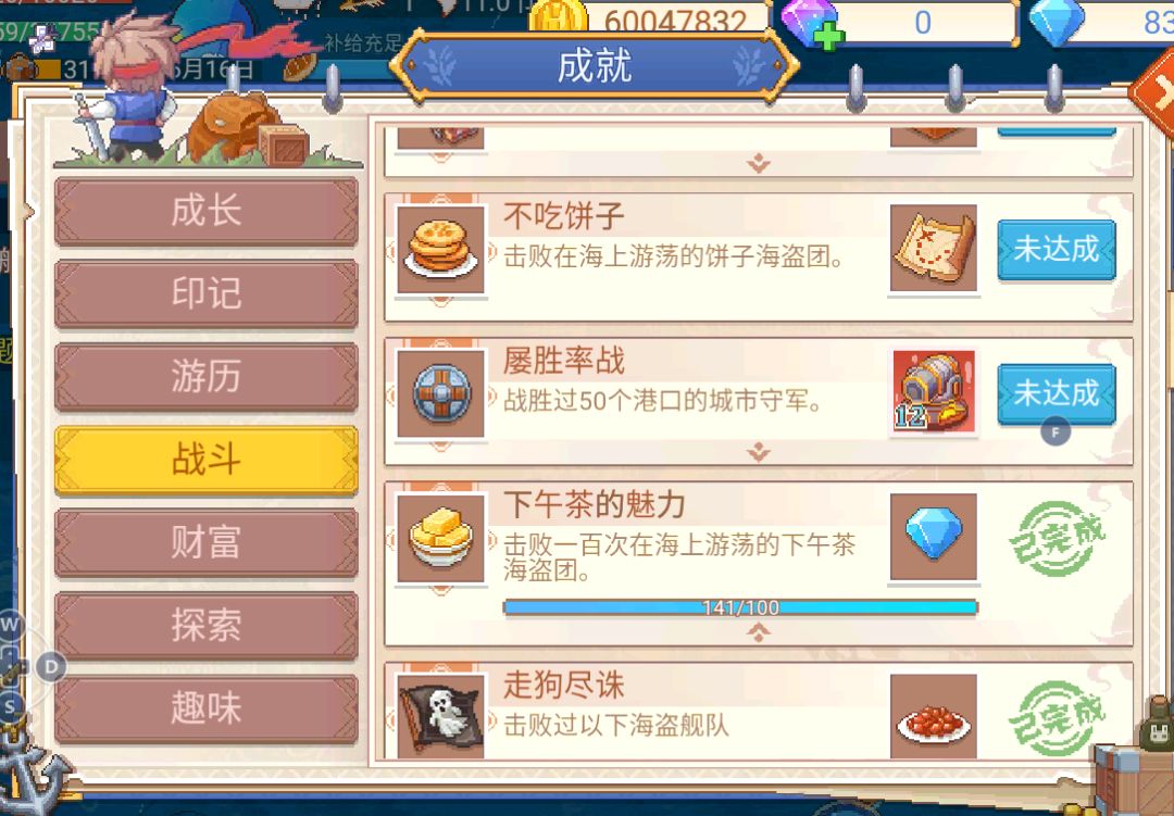 因为此路线大部分的海盗都能打得过,所以不开投降,并且顺便刷以下两个带次数的海盗成就