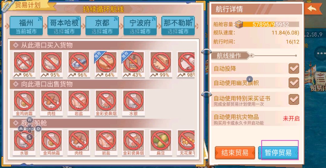 基本都是欧洲-亚洲各一来回跑,感觉京都卖宁波收益也不错所以加多一个。至于买的物品基本先推荐余下有仓再买其他能买的,下一个港口全卖。