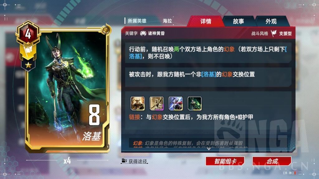 技能选择方面,幻想军团和勇士精魄是很好的战力技能,独自为伴也可以为自己提供一定的稳血能力,因为当前天梯环境情报居多,本卡组卡牌攻击力都不高,很容易0身材无法行动,勇士精魄可以在身材清零的时候给自己提供一个能动起来的机会,洛基动起来了大家懂的。