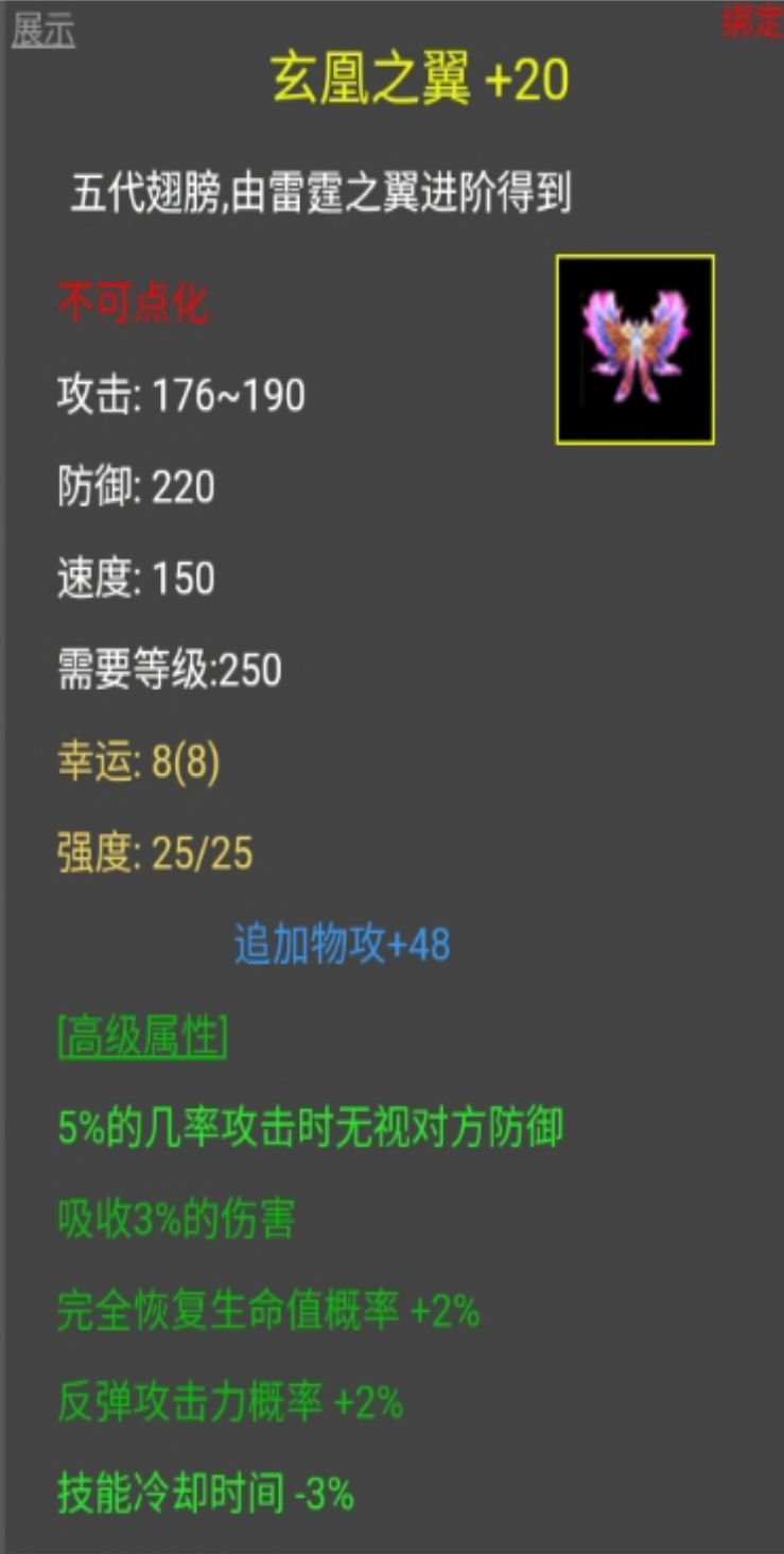 进阶三代翅膀:将二代翅膀幸运,强度点满,花费八十根羽毛就能进阶为三代翅膀,进阶三代翅膀的变化与一代变二代一样,二代翅膀进阶为三代翅膀后,追加属性将固定,以后进阶也不会改变种类与数值。