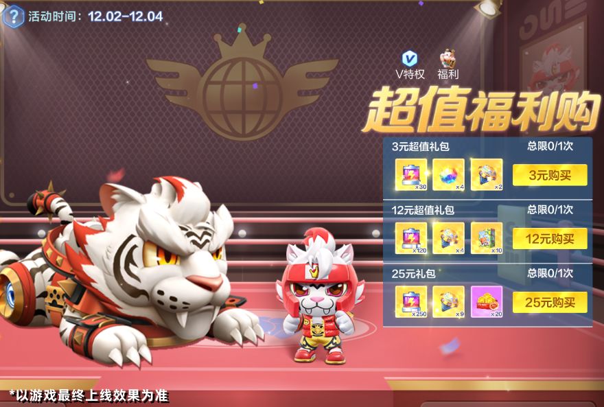 12月2日-12月4日,福利站将限时开启【超值福利购】活动,活动期间可直购超值礼包,支付成功后可立即获得不同档位电池、星愿结晶、炽金启动器、宝宝礼物盒等对应礼包奖励。直购金额自动计入V积分,并支持激活招财猫和进宝猫。