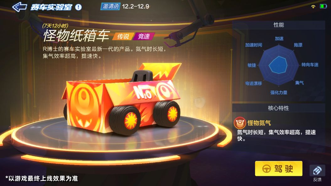 12月9日之前,车友们可以在赛车实验室领取并体验这款全新的怪物纸箱车,快来帮助R博士收集更多实验数据吧!
