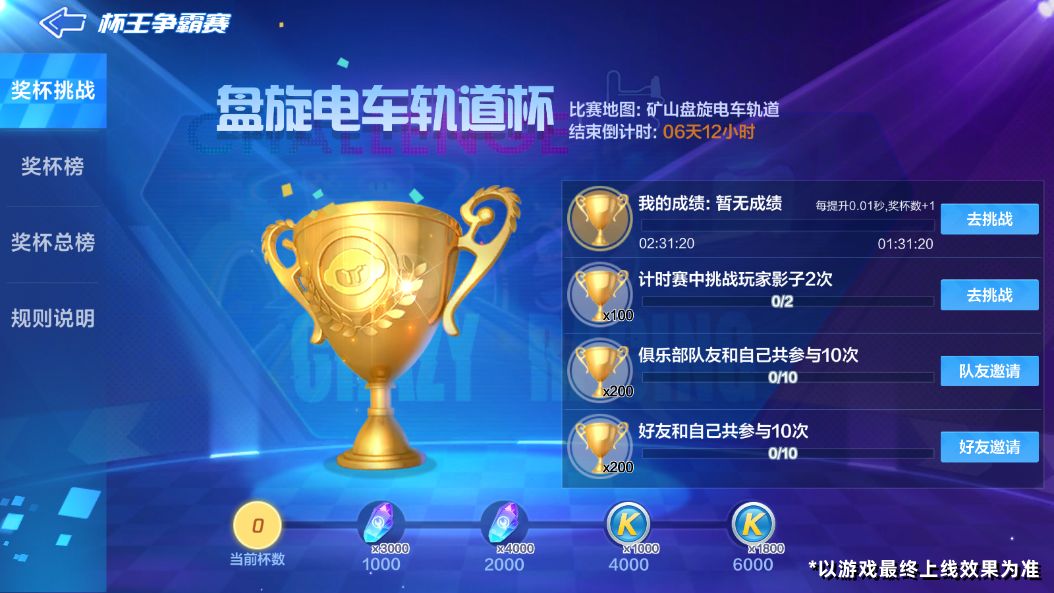 活动期间,车友们可通过完成活动的对应任务获得奖杯,并且兑换能量水晶和酷币。