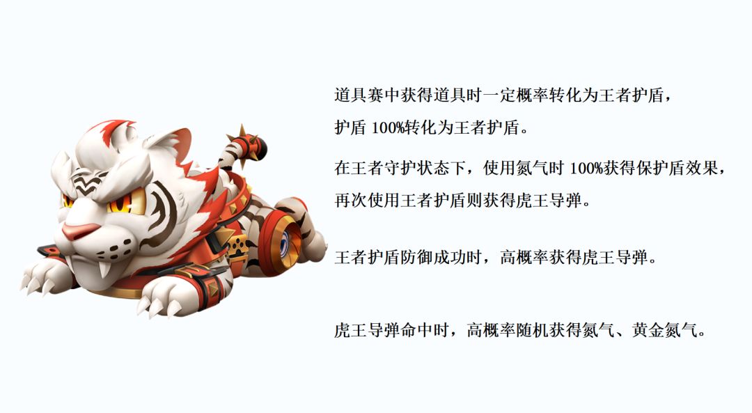 在王者守护状态下,使用氮气时100%获得保护盾效果,再次使用王者护盾则获得虎王导弹。