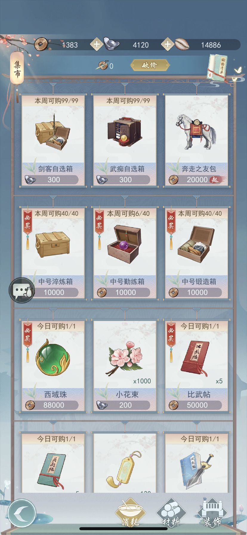 中号勤练箱每周必买!!!然后还有铜币可以买锻造箱、淬炼箱。铜币永远缺╰(⇀‸↼)╯