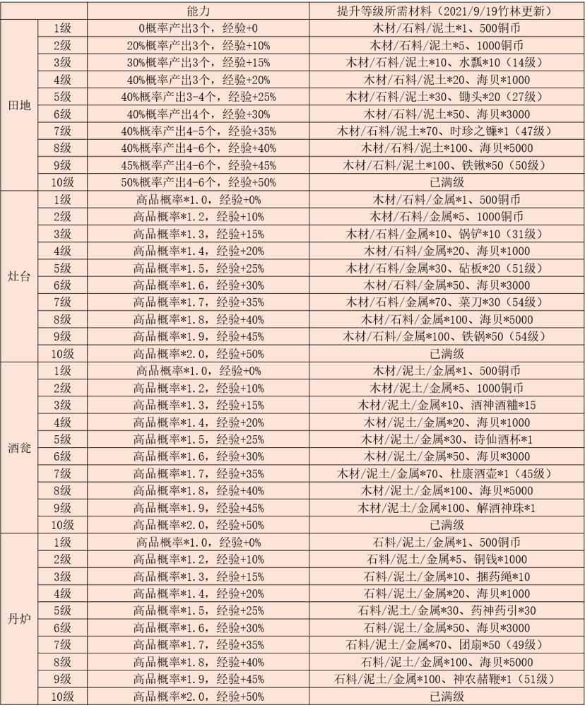 优先升级田地>灶台>酒翁>丹炉升级