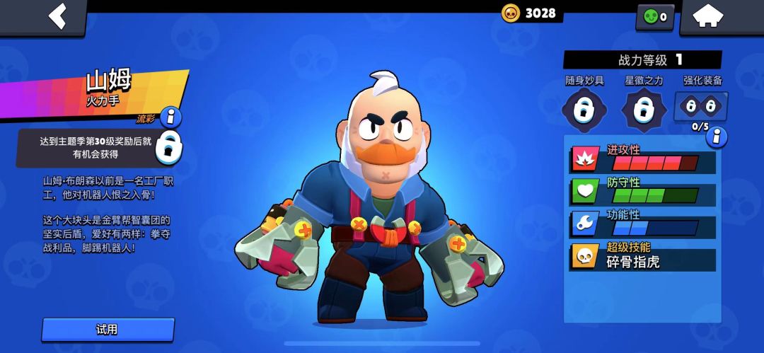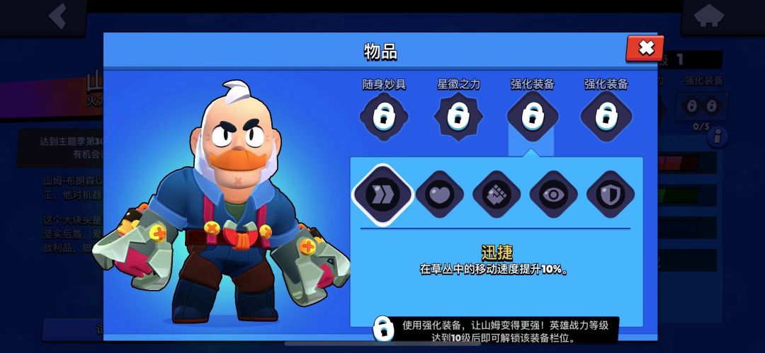 五:强化道具在荒野乱斗中常规模式下推荐迅捷+强攻,作为近战移速是他唯一接近敌人的手段,搭配释放大招后的移速加成瞬间贴近敌人捡回指虎恢复血量暴力输出!六:山姆如何进阶