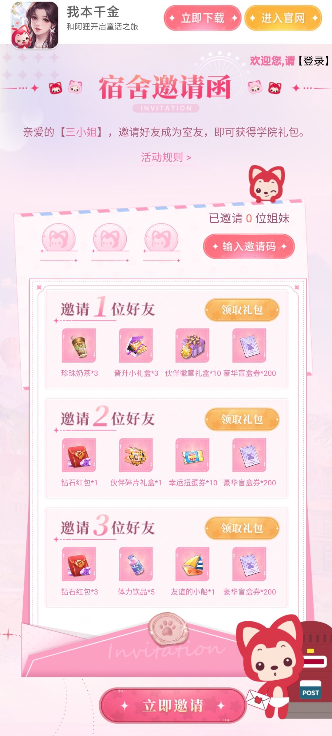 福利二:千金学院招新啦,三小姐邀请好友成为自己的室友,即可获得学院礼包奖励!