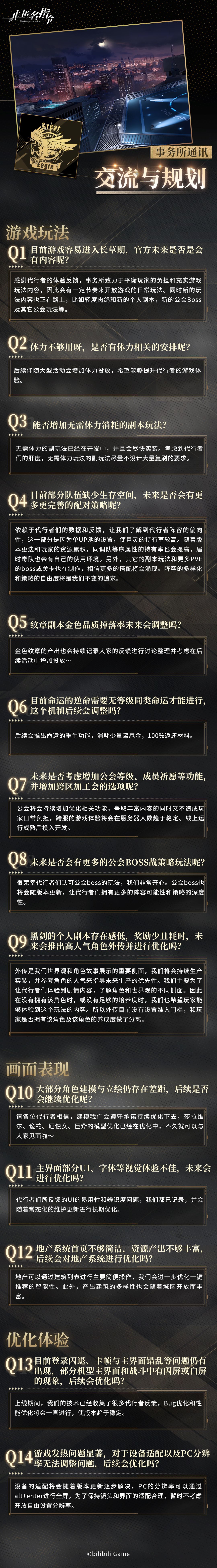 自公测以来,事务所始终关注与重视代行者们的反馈与建议,对此罗贝塔整理了一份【事务所通讯 交流与规划】,诚挚邀请代行者们给我们提出更多建议继续支持非匿名指令~