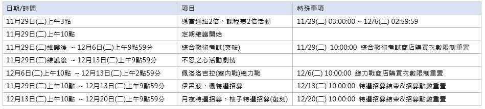 * 以下為開始/結束時間較為特別的遊戲內容主要日程表,詳細內容請確認各項目的更新詳細說明。