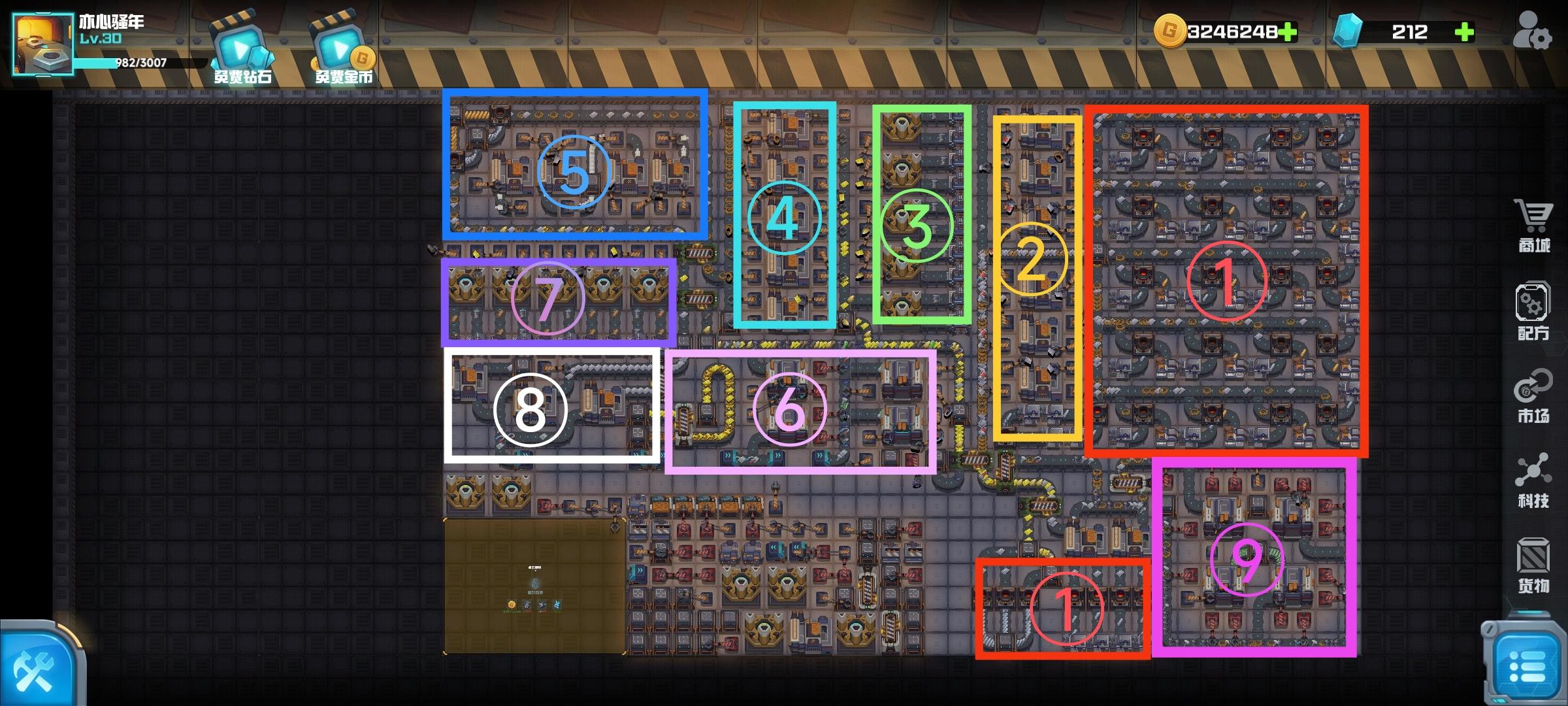 这个是我用之前玩的手头上就有的建筑摸索出来的生产线,地皮刚刚好够用,紫瓶的生产效率有点低,但总体上不容易卡壳。分享一下,希望能帮到各位。