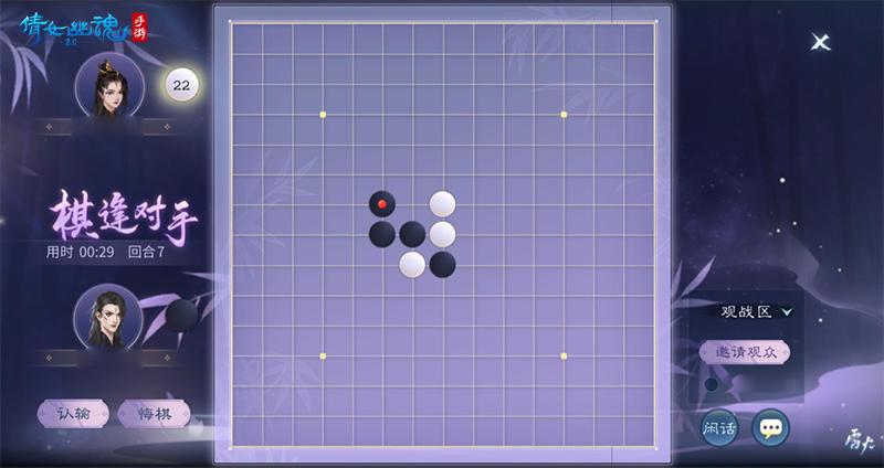师徒可以同在立雪园中【竹林对弈】。棋局采用五子棋玩法规则,优先将五颗棋子直线相连的一方获胜。师父在接取任务后落座,点击加号邀请有任务的徒弟进入棋局,若邀请同门师兄妹观战还可获得额外奖励!为确保每位棋手都能拥有良好的下棋体验,需要师徒进行至少10回合以上的3局对决即可获得奖励。师徒对弈,谁将拔得头筹?