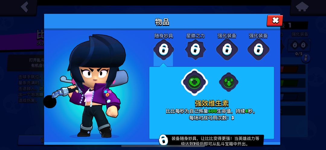 比比到达7级时,我们就可以研究一下她的强力泡泡糖(1)强效维生素使用后每秒恢复600点生命值持续4秒!比比嚼的口香糖里面居然含了大量维生素!(调皮一下)(2)超黏泡泡糖比比的下次超级技能后将会对敌人附加2秒的减速效果,这就弥补了作为近战的比比拥有更多接近敌人或者黏住敌人的手段。