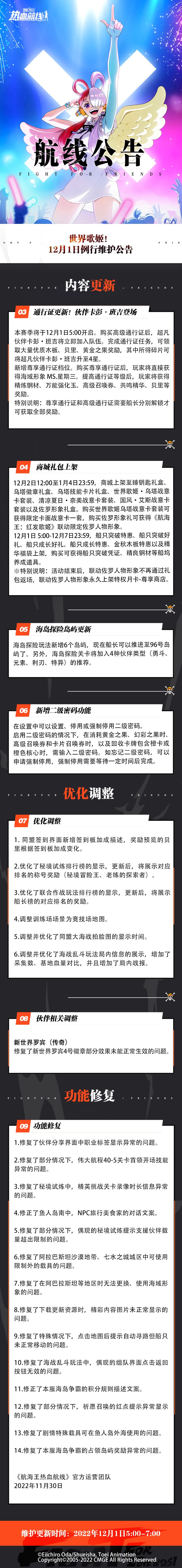 为了各位船长旅途更丰富、航行更平稳,《航海王热血航线》将于2022年12月1日5:00-7:00进行维护更新,预计停服维护2小时(可能根据实际情况提前或延后),届时将无法登录游戏,请大家互相转告并提前下线,避免不必要的损失。