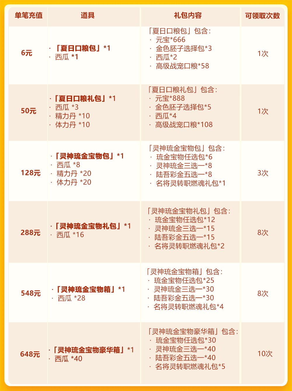 3.「夏日礼盒」可开出:哈密瓜*111、玄阵养成包*50、觉醒丹*888、天命石*888、极品精炼石*888、安魂石*666、军师列阵包*40、名将图鉴包*40、宝物精炼石*888、哈密瓜*6、玄阵养成包*5、觉醒丹*100、天命石*100、极品精炼石*22、安魂石*11、军师列阵包*1、名将图鉴包*1、宝物精炼石*60中的随机1种。