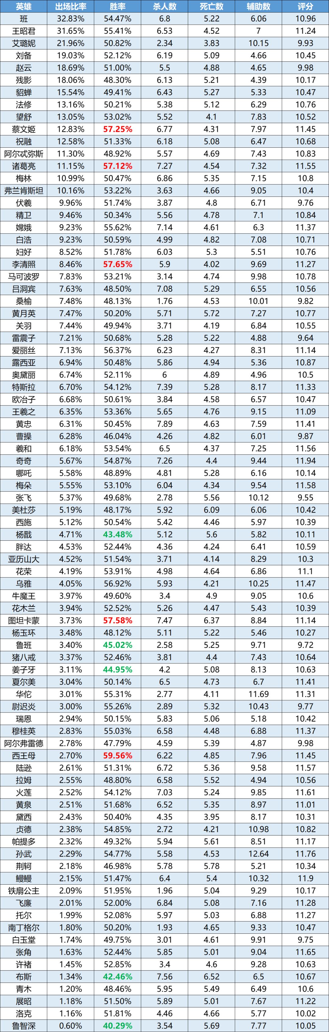 注:此榜单按出场率由高到低排序,标红为胜率前5的英雄,标绿为胜率排名倒数的英雄