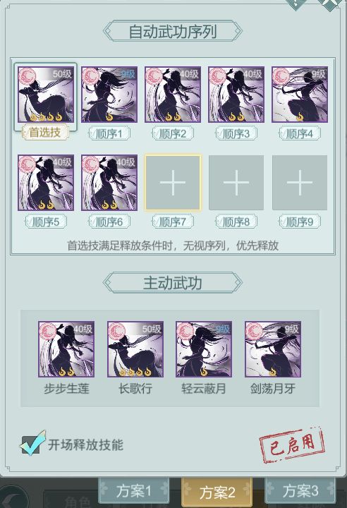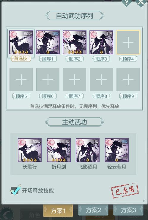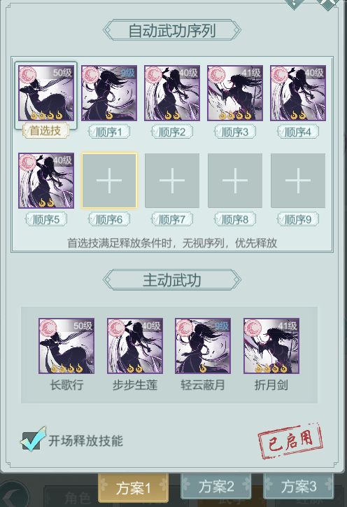 升级顺序 剑招>内功>身法>折月>长歌>步步>万剑>招架>轻云