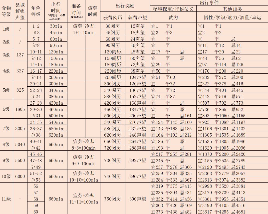 这里推荐每天领一次药店+两次酒楼,先把药店升2级,然后一直升酒楼,因为出行高级区域需要你的江湖属性达到一定值才能成功,不然就会失败导致生病,然后4个小时不能出行。(属性要求请看下图,由竹林大佬整理)