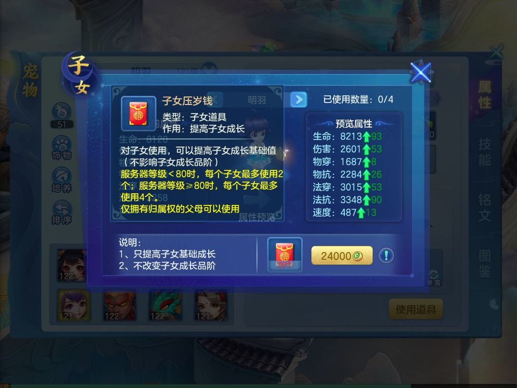 2)子女压岁钱的使用限制由每年最多使用2个压岁钱调整为服务器<80时,每个子女最多使用2个压岁钱;服务器≥80时,每个子女最多使用4个压岁钱;